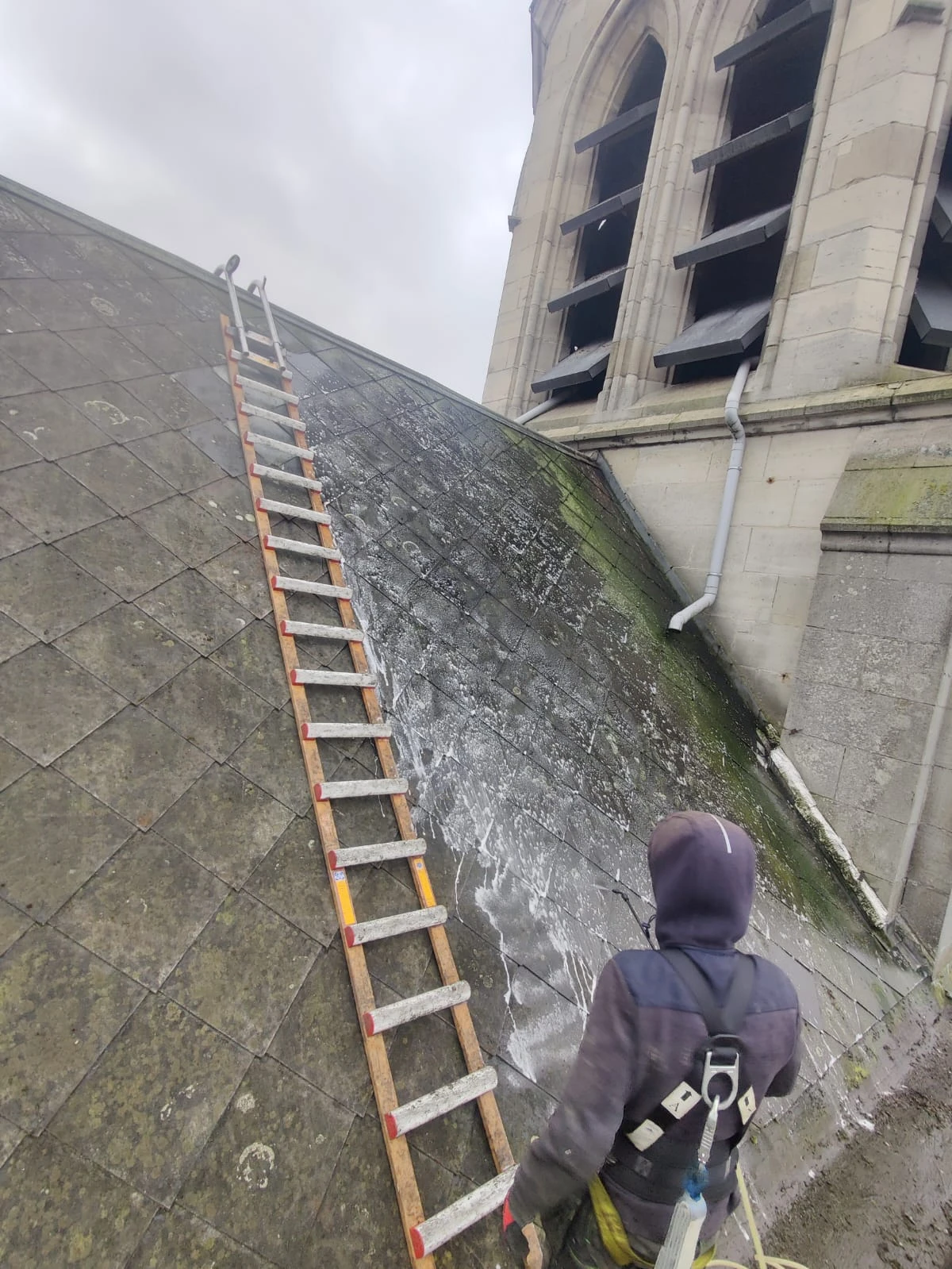 Nous avons procédé à un grattage manuel minutieux des mousses et lichens incrustés, afin d'éliminer les dépôts en profondeur sans abîmer les tuiles.
